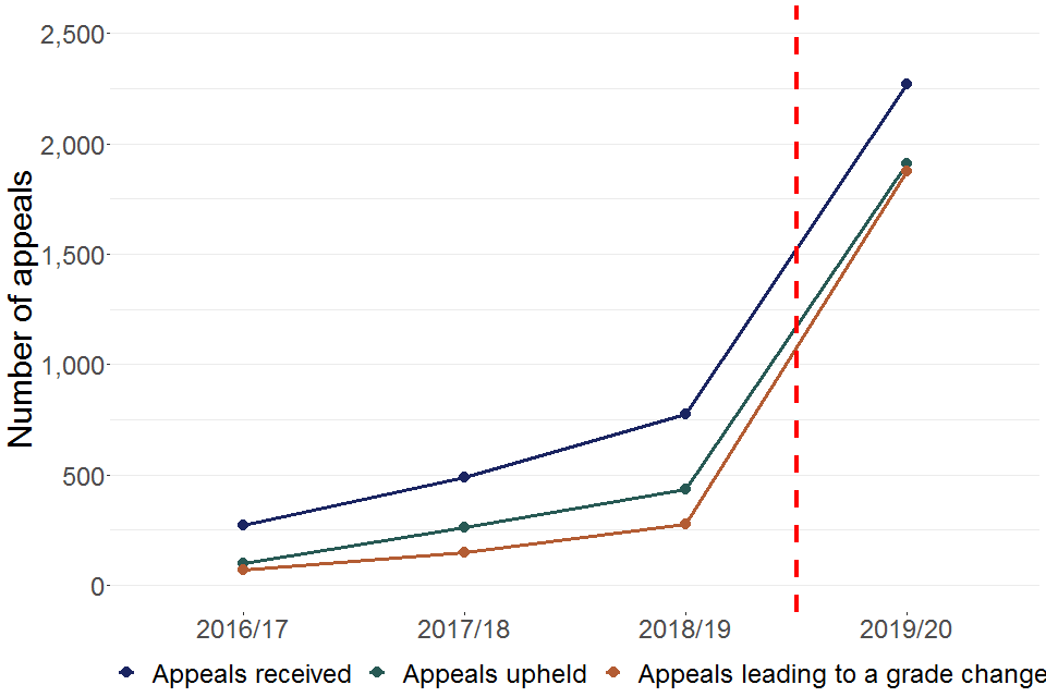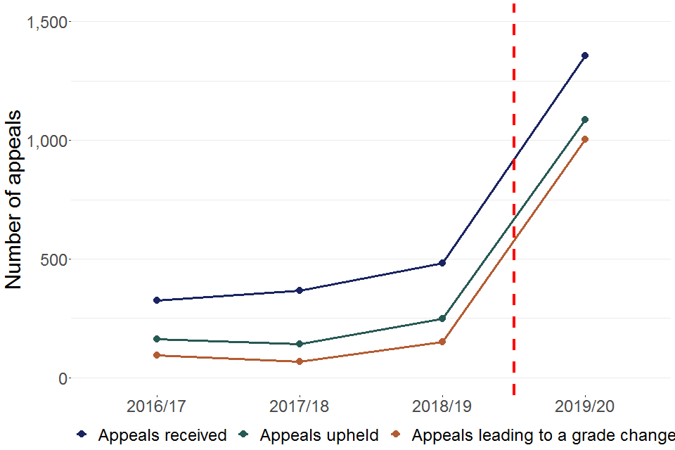 | Year | Appeals received | Appeals upheld | % of appeals upheld | Appeals leading to at least one grade change | % of upheld appeals leading to at least one grade change |
