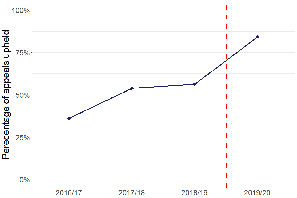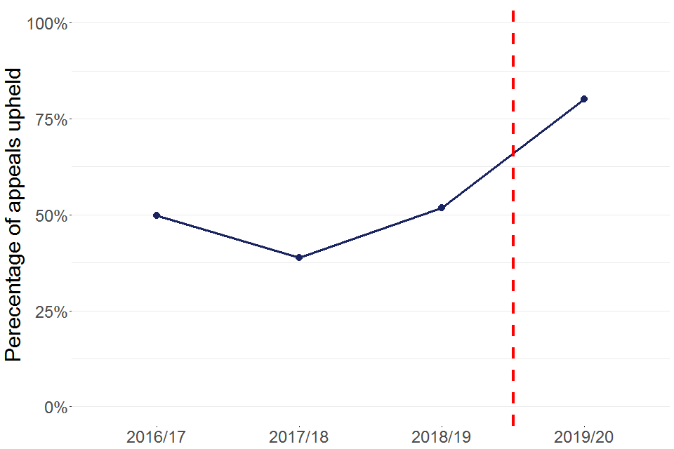 The changes between 2018/19 and 2019/20 reflect the difference in the appeals process in summer 2020. Direct comparisons between years are not valid and need to be treated with caution