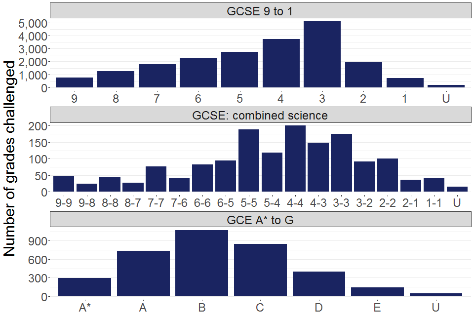 Grade 3 was the most contested grade for GCSE 9 to 1, grade 4-4 the most contested grades for GCSE combined science and grade B the most contested grade for GCE.