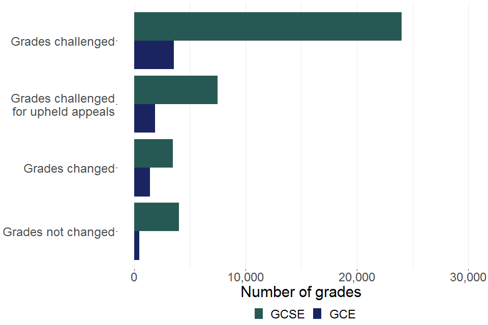 Overall, 27,560 (0.45%) of the 6.1 million grades certified for GCSEs and GCEs (AS and A levels) were challenged.