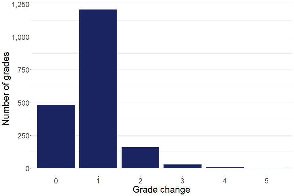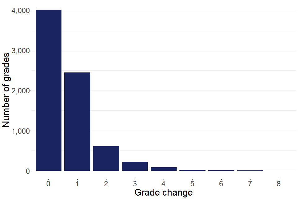 The charts in this section show the magnitude of grade changes made following an upheld appeal in 2019/20. A small number of upheld appeals were in respect of candidates whose original grade was unknown. Those cases do not appear in these graphs. These graphs also do not include instances where the post appeal qualification grade is not known.