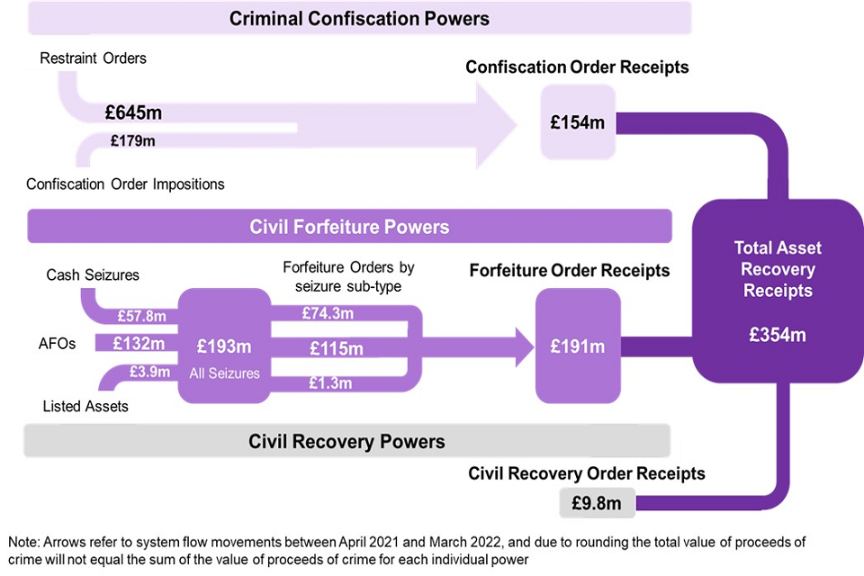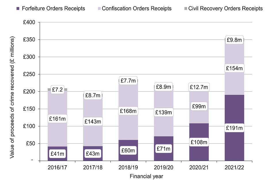 £354 million was recovered in total from Confiscation Order, Forfeiture Order and Civil Recovery Order receipts in the financial year 2021 to 2022.
