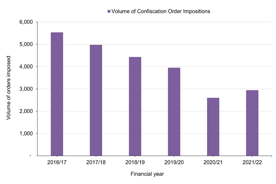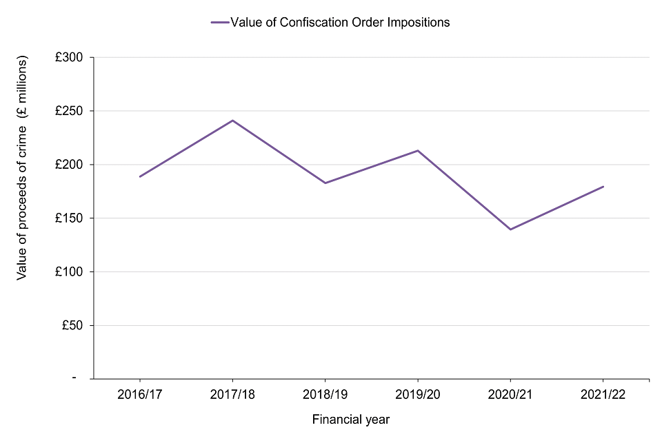 £179m of Confiscation Orders were imposed in 2021 to 2022, a 29% increase from £139m in the previous financial year and a 5% decrease from £188m since 2016 to 2017, based on nominal values i.e., not adjusted for inflation.
