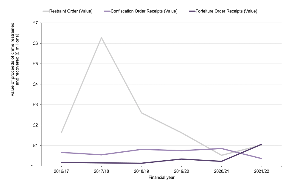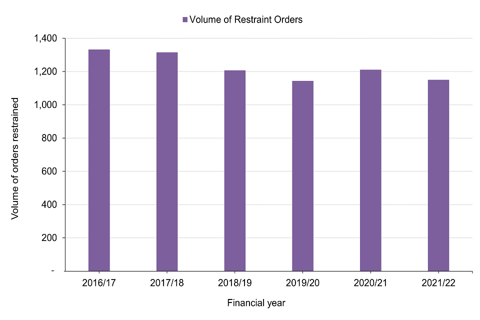 Restraint Orders however have been on a generally downward trend since 2017 to 2018, where they peaked at £6.3m and then fell, reaching their lowest trough in 2020 to 2021 and increasing slightly in 2021 to 2022 (based on nominal values).