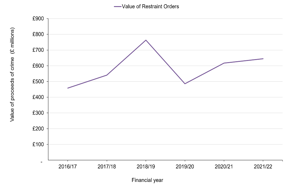£645m was restrained from Restraint Orders in 2021 to 2022, a 5% increase from £617m in 2020 to 2021, and a 41% increase from £458m since 2016 to 2017, based on nominal values i.e., not adjusted for inflation.