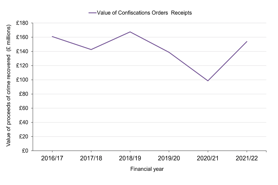 £154m of proceeds of crime was recovered through Confiscation Order receipts in 2021 to 2022, based on nominal values, and can be explained by several high value orders which arose within the same financial year