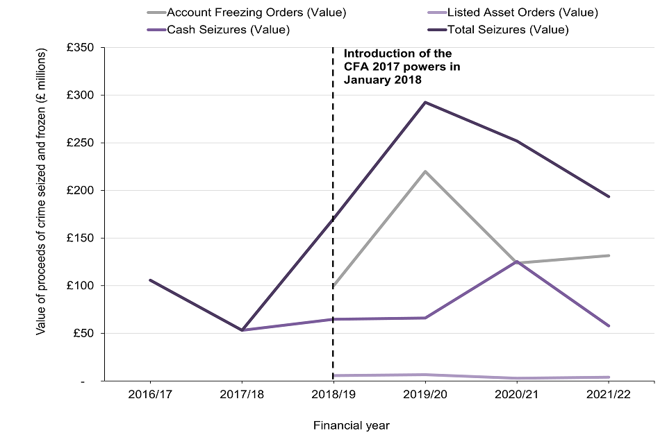 £193m was seized and frozen from Cash Seizures, AFOs and Listed Asset Orders in 2021 to 2022, which is 6% above the 6-year median of £182m and can be explained by the increase in the proceeds of crime seized under Account Freezing Orders, based on nominal values