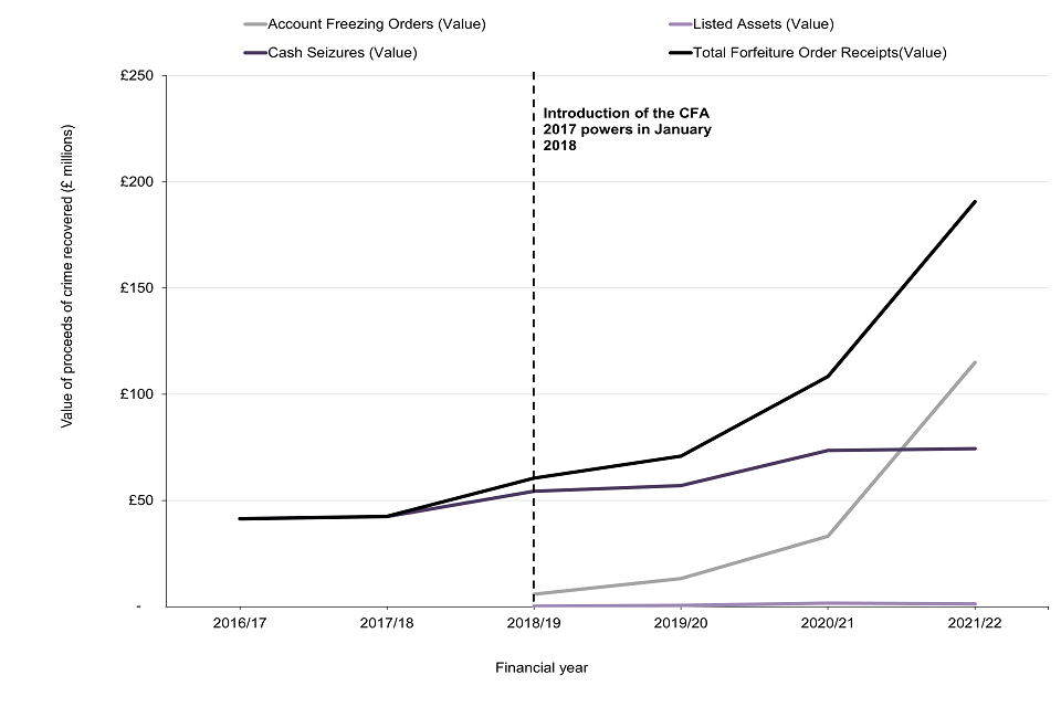 £191m of proceeds of crime was recovered through Forfeiture Order receipts 2021 to 2022, based on nominal values, which can be explained by several high value cases processed under Account Freezing Orders within this financial year
