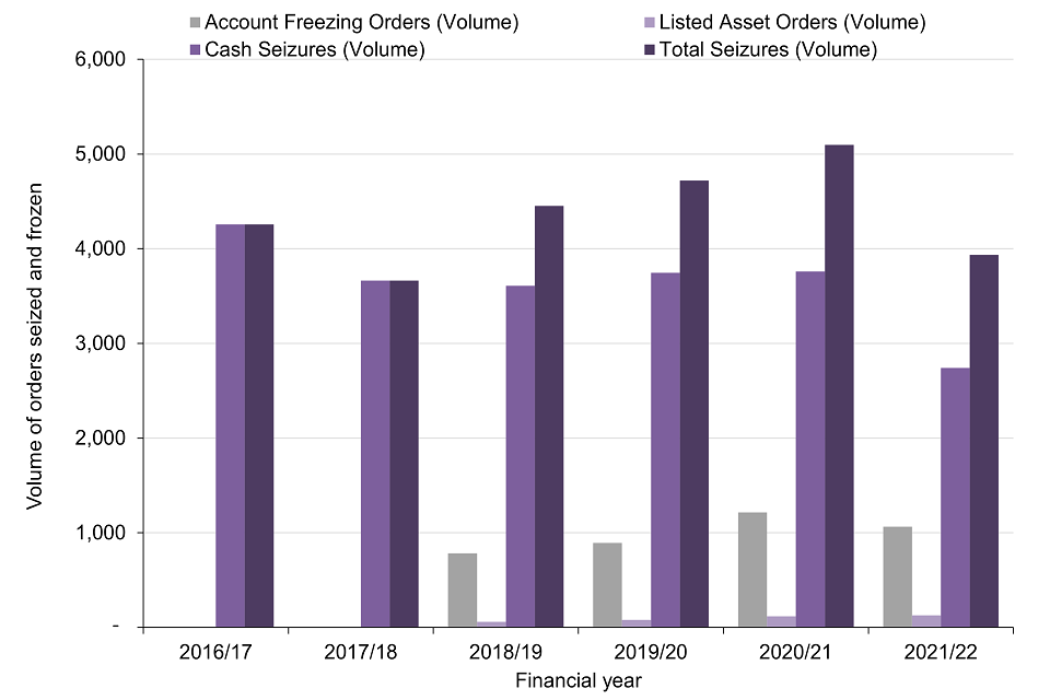 - the value and volume of proceeds of crime seized and frozen through all Seizure sub-type Forfeiture powers