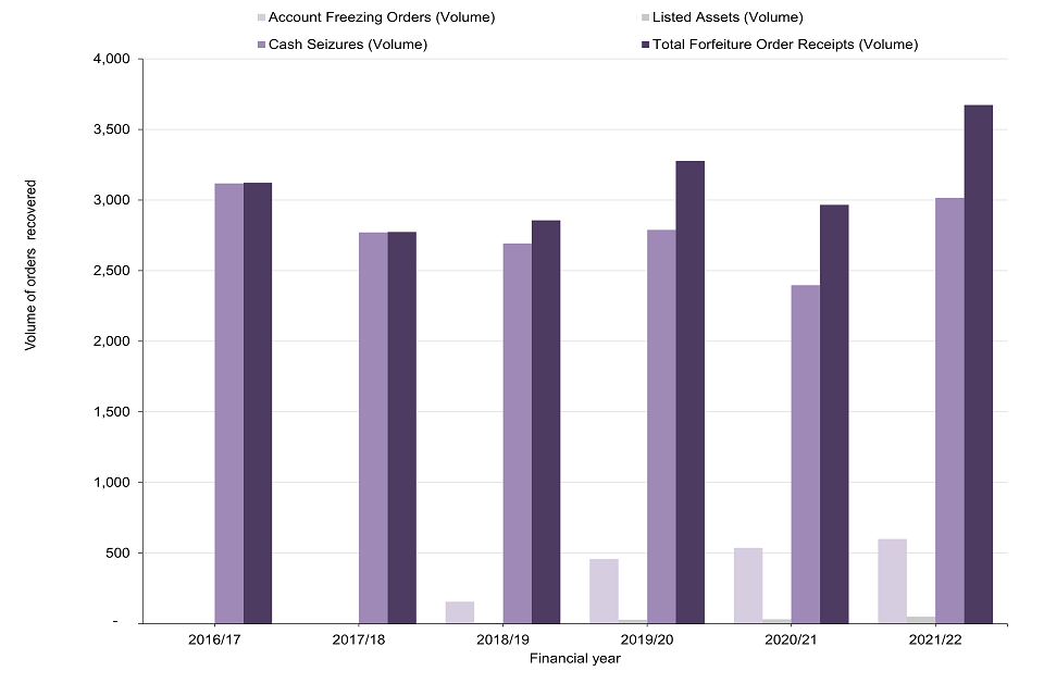 - the value and volume of proceeds of crime recovered from Forfeiture Order receipts and through all Seizure sub-type Forfeiture Order powers