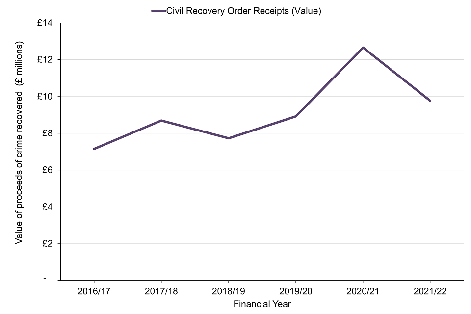 £9.8 million was recovered through Civil Recovery Order Receipts, a 23% decrease from 2020 to 2021, but 11% higher than the 6-year median amount recovered, based on nominal values i.e., not adjusted for inflation