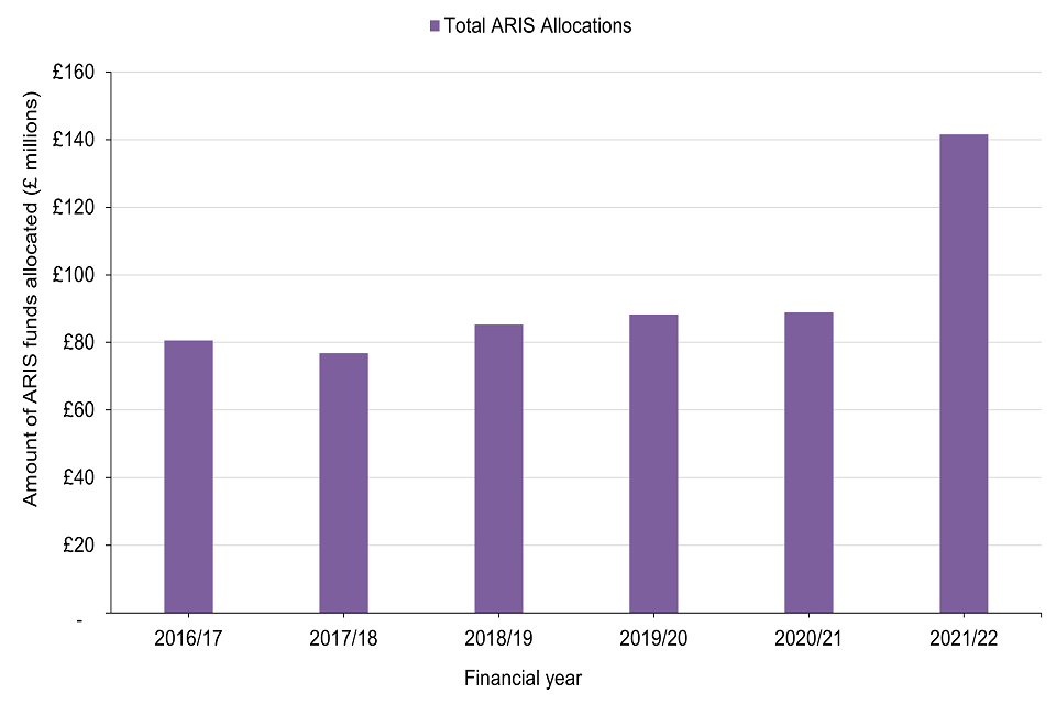 £142m of ARIS funding was distributed to POCA Agencies in 2021 to 2022. The data presented shows that ARIS Allocations to POCA Agencies grew by 76% over the reporting period, up from £80.6m in 2016 to 2017, based on nominal values i.e., not adjusted for inflation.