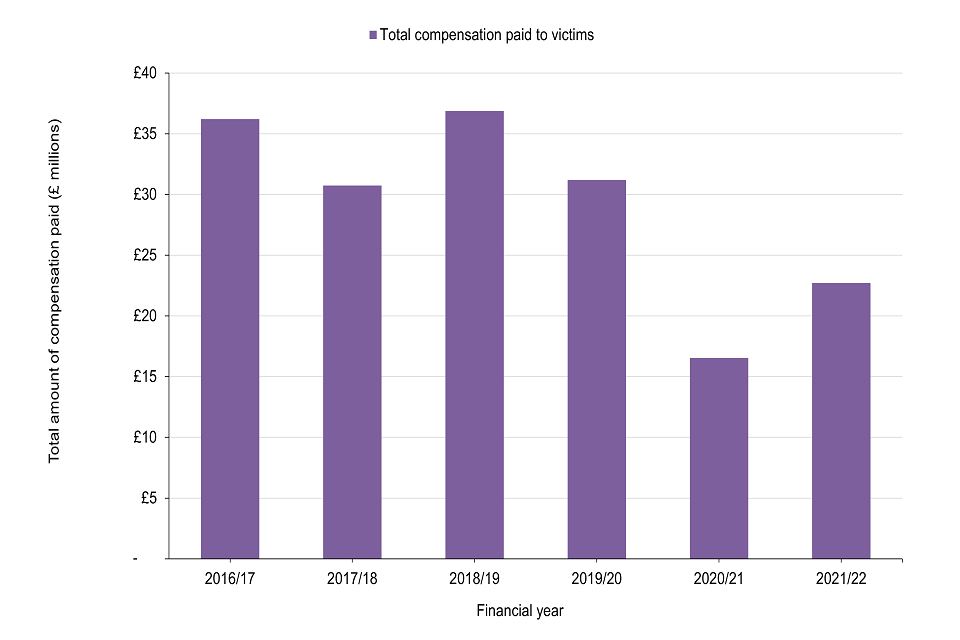 £23 million was paid in compensation to victims from proceeds of crime recovered through Confiscation Order receipts in 2021 to 2022, a 37% increase from 2020 to 2021, but a 27% decrease from the 6-year median, based on nominal values i.e., not adjusted for inflation, which is linked to the overall decline in Confiscation Order Impositions and subsequent receipts which have fallen in the same period