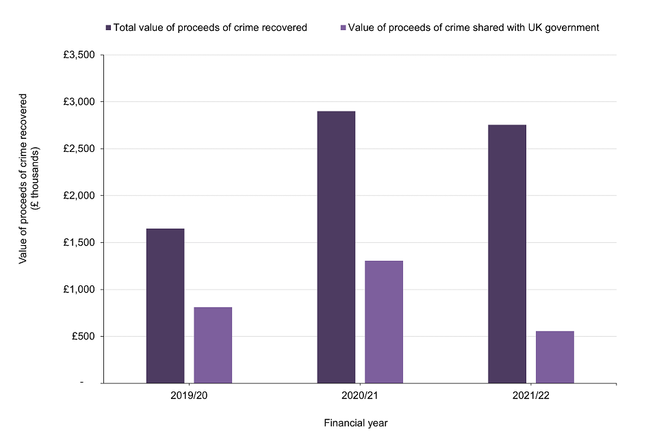 In the financial year 2021 to 2022 a total of £2.8m was recovered through International Cooperation, a decrease of 5% compared to £2.9m in 2020 to 2021, based on nominal values i.e., not adjusted for inflation. However, the value of money retained by the UK Government has decreased from £1.3m to £0.6m, as the percentage of proceeds of crime retained has reduced from 45% to 20% (based on nominal values). This is because some cases in 2021 to 2022 involved overseas victims, leading the UK to share above the usual proportion of 50% of the recovered proceeds to recognise this and allow for compensation to be paid.