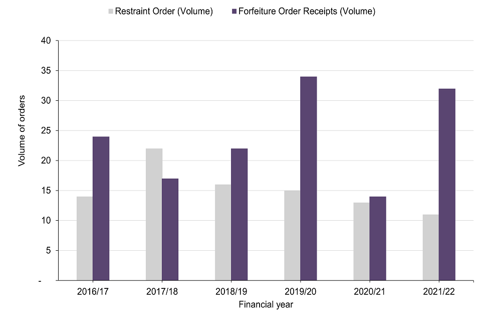 In 2021 to 2022 there were approximately 30 Forfeiture Orders, showing an increase of 129% compared to the previous financial year where there were approximately 10 Orders. Restraint Orders, however, have decreased by 15% from the previous financial year.