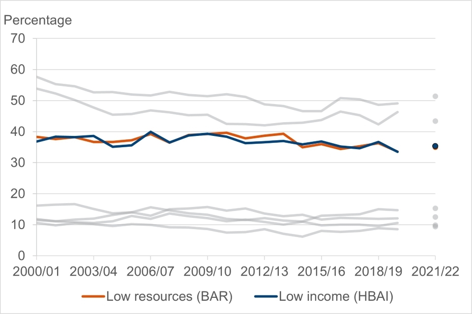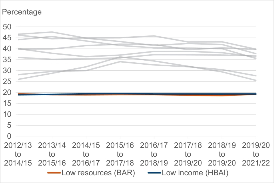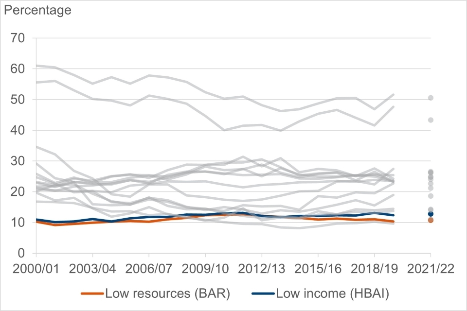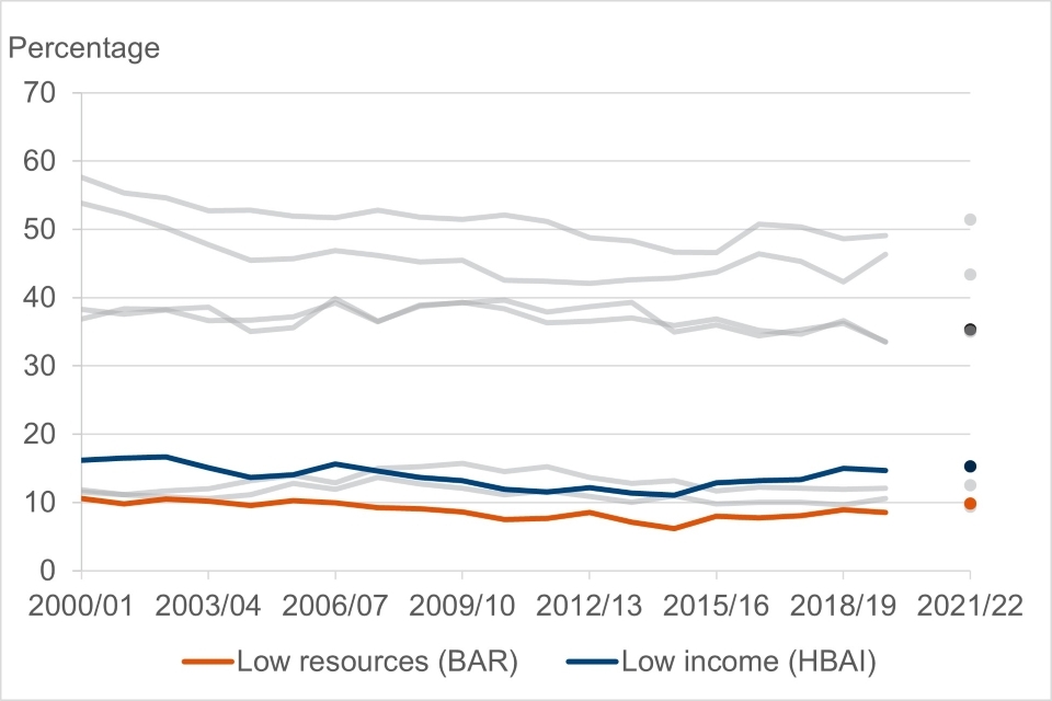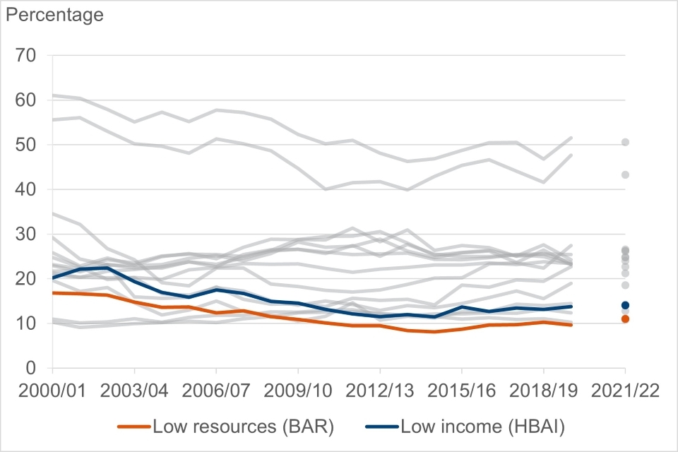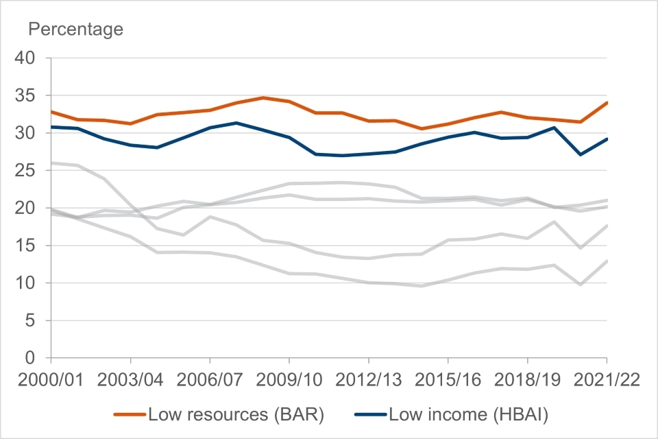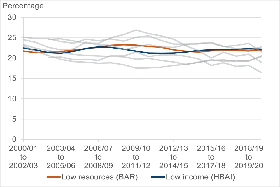 - comparison of estimates of Below Average Resources (BAR) and income (HBAI) for FYE 2001 through to FYE 2022. This illustrates where the new BAR approach suggests differences for poverty trends