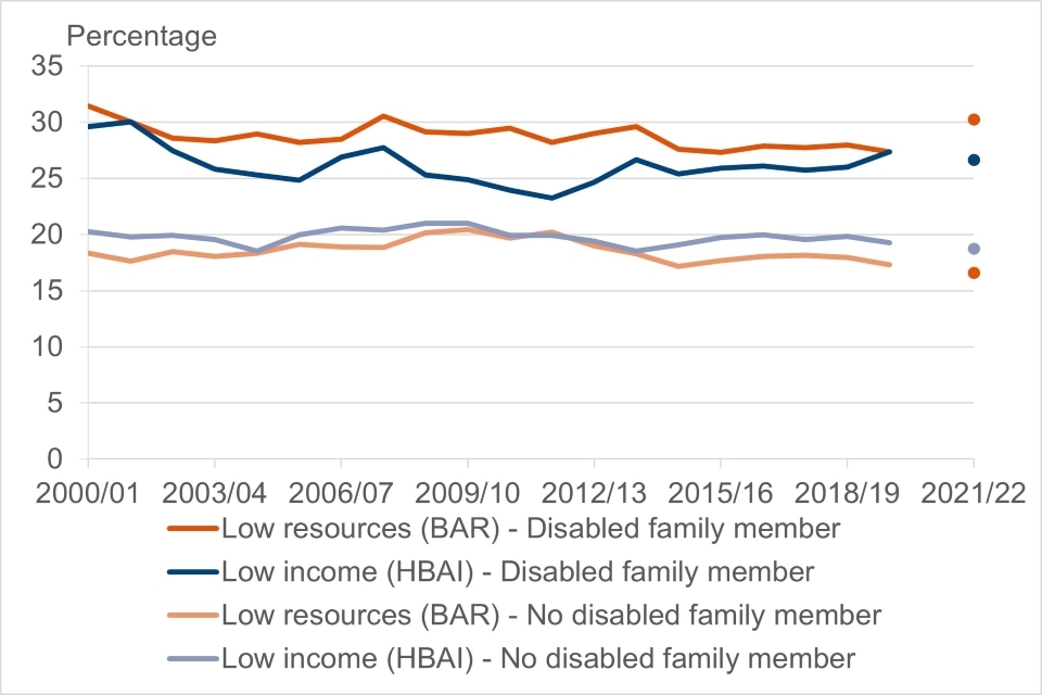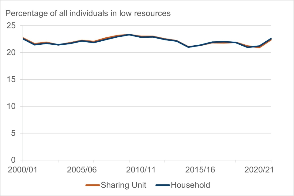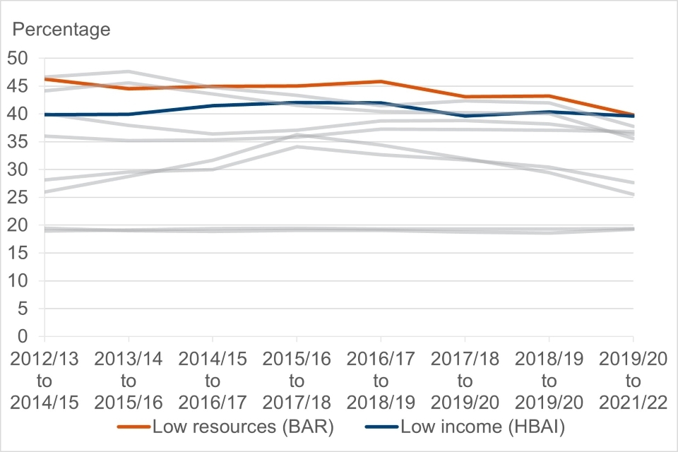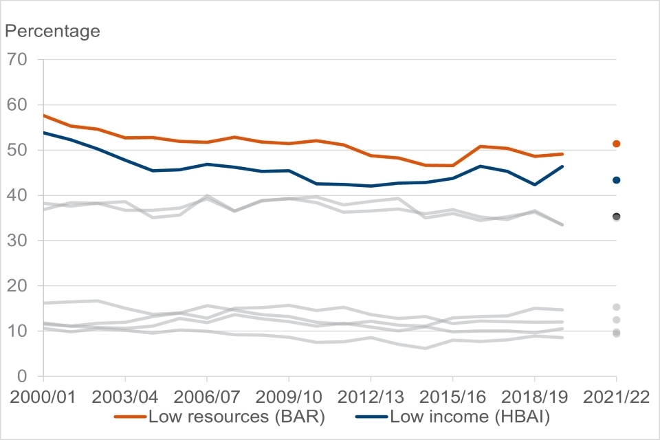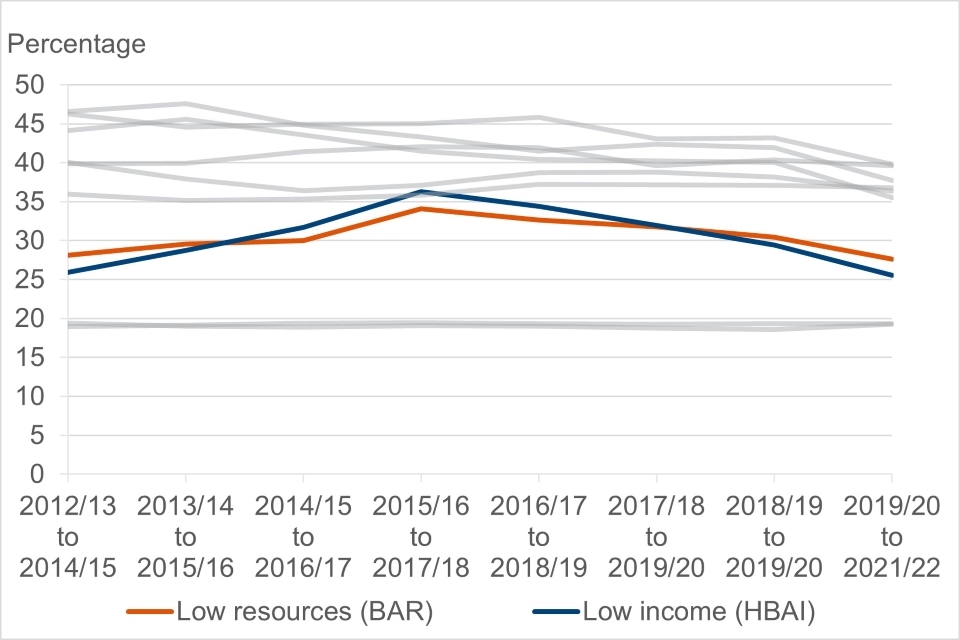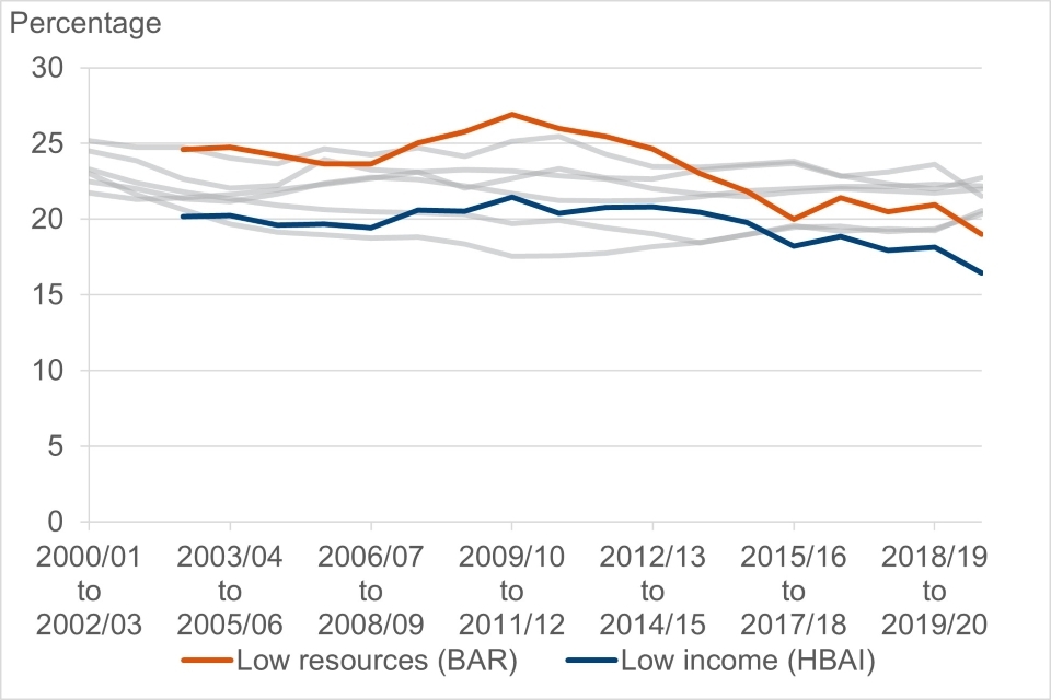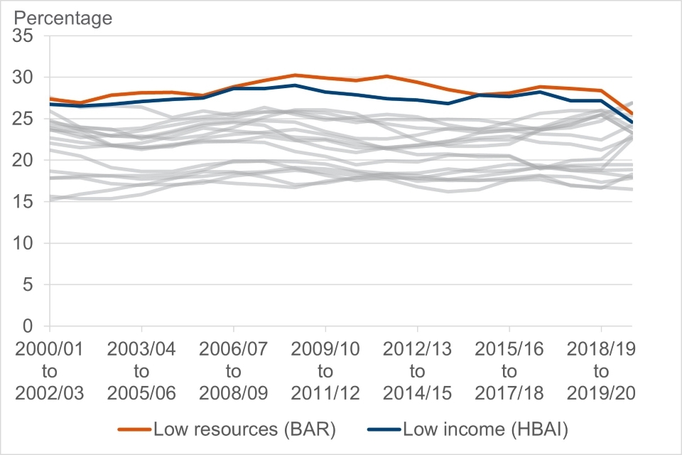 - comparison of estimates of Below Average Resources (BAR) and income (HBAI) for FYE 2001 through to FYE 2022. This illustrates where the new BAR approach suggests differences for poverty trends