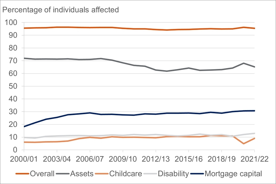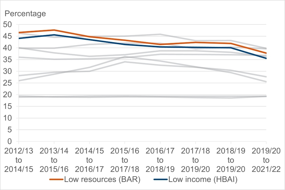 This illustrates that, overall, for those in low resources, more than half were below 25% of the BAR threshold in FYE 2022. This is mostly driven by working age adults (61% are below 25% of the threshold) and children (49% are below 25% of the threshold) in FYE 2022. A lower percentage of pensioners in low resources (41%) were below 25% of the threshold in FYE 2022 and historically.