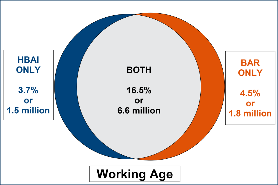 | 25.1% to 50% above | 9% (5.7 million) | 12% (1.7 million) | 8% (3.1 million) | 8% (0.9 million) |