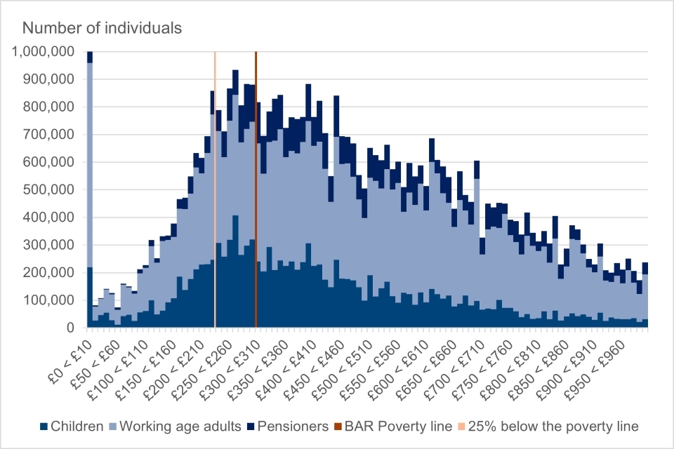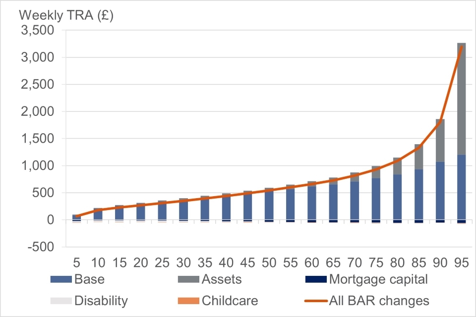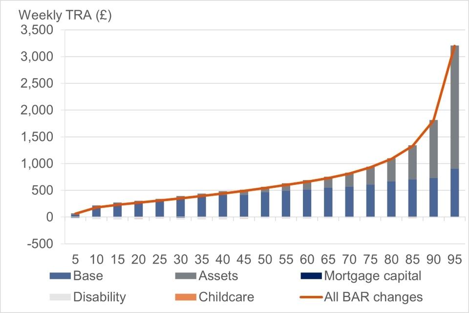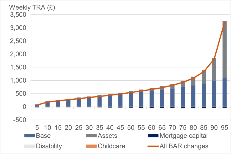 - in the BAR calculation, anyone with negative TRA is counted as having £0 TRA, hence the large number of individuals in the bottom income bracket