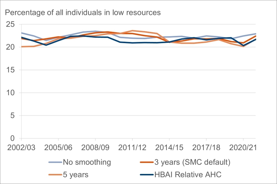The SMC also propose as the measure develops, where methodological changes significantly change the number of individuals in low resources in FYE 2017, the threshold will be altered so that the overall numbers in low resources remain consistent with those for relative low income AHC on HBAI in FYE 2017.