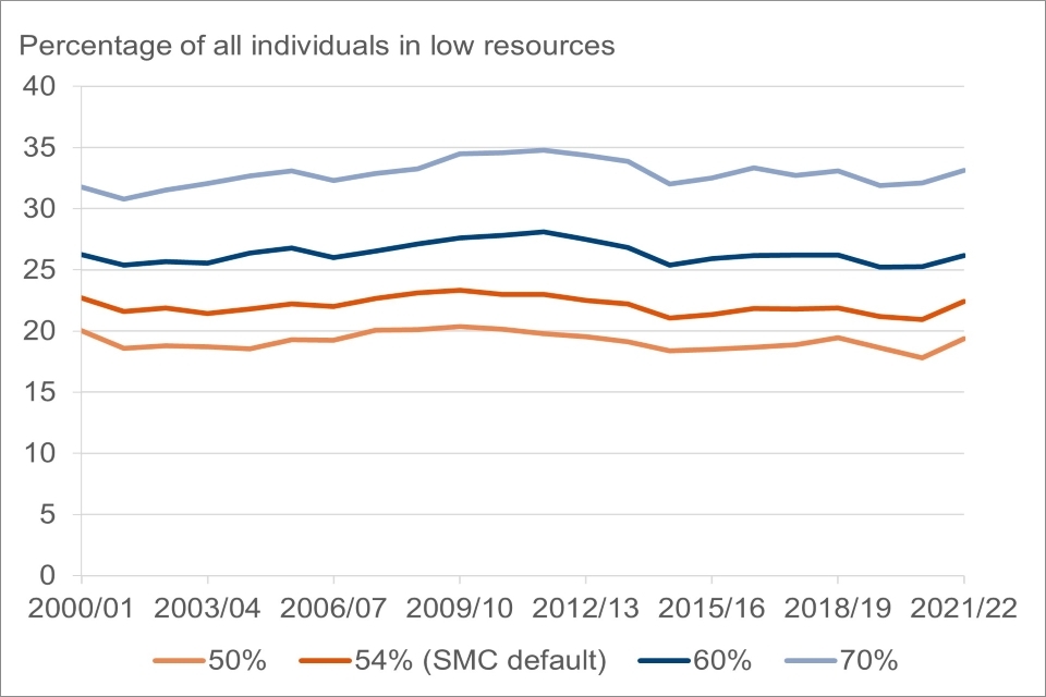 For HBAI, estimates are published for thresholds based on 50%, 60%, and 70% of median income (though note HBAI does not apply the smoothing via three-year averaging). The SMC set their poverty threshold at 54% of smoothed median equivalised TRA. This threshold was chosen as it is the value that gives overall poverty estimates matching those of relative low income AHC (HBAI) for a chosen reference year of FYE 2017. The SMC adopted this approach because their aim was to create a measure that provided a more accurate picture of the composition of individuals in poverty and how both levels and composition change over time, and because it concluded that the choice of poverty thresholds is somewhat arbitrary.
