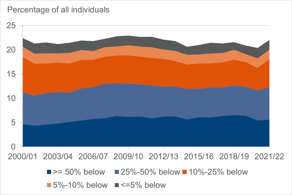 Figure 6.1.2: Percentage of individuals in each depth band, for those below the poverty threshold, FYE 2001 to FYE 2022