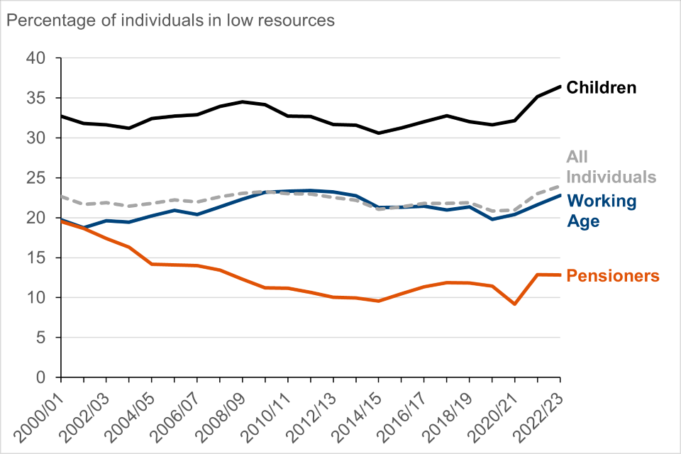 Individuals in couple, non-pensioner benefit units also saw a rise in the percentage in low resources, although not as substantial. The percentage of individuals in couple, non-pensioner benefit units with and without children both rose by 1 percentage point between FYE 2022 and FYE 2023, to 28% and 12% respectively.