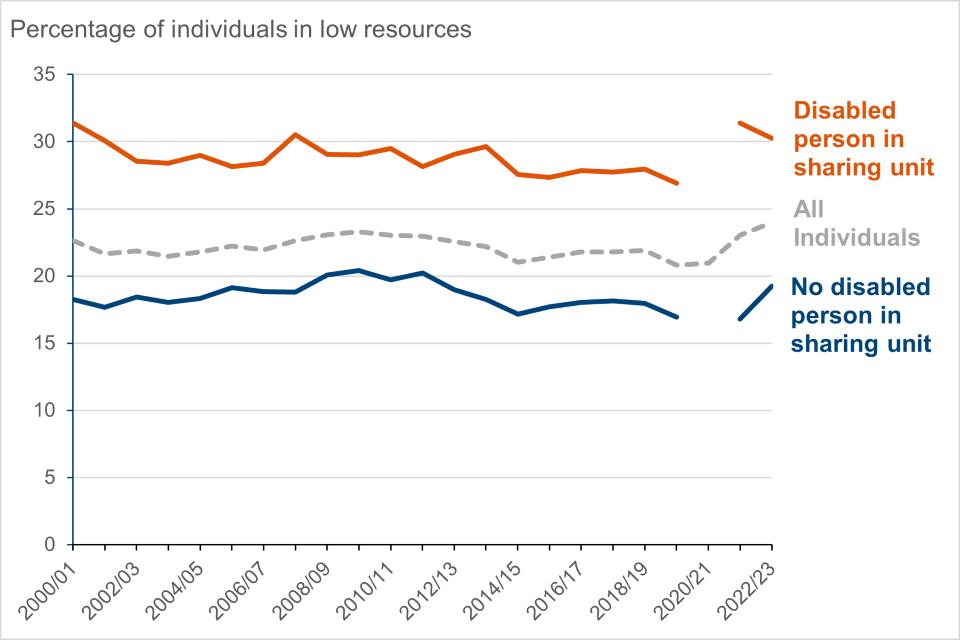 Figure 3: Percentage of individuals in low resources by disability status of sharing unit, FYE 2001 to FYE 2023