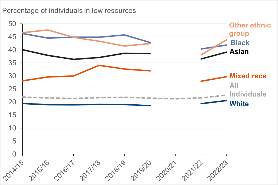 Between FYE 2022 and FYE 2023, the percentage of individuals in low resources rose for all ethnic groups. The largest increases were seen in Asian/ Asian British and other ethnic groups which rose by 3 and 6 percentage points respectively.