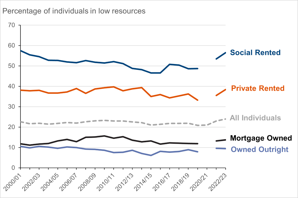 Figure 6: Percentage of individuals in low resources by tenure type, FYE 2001 to FYE 2023