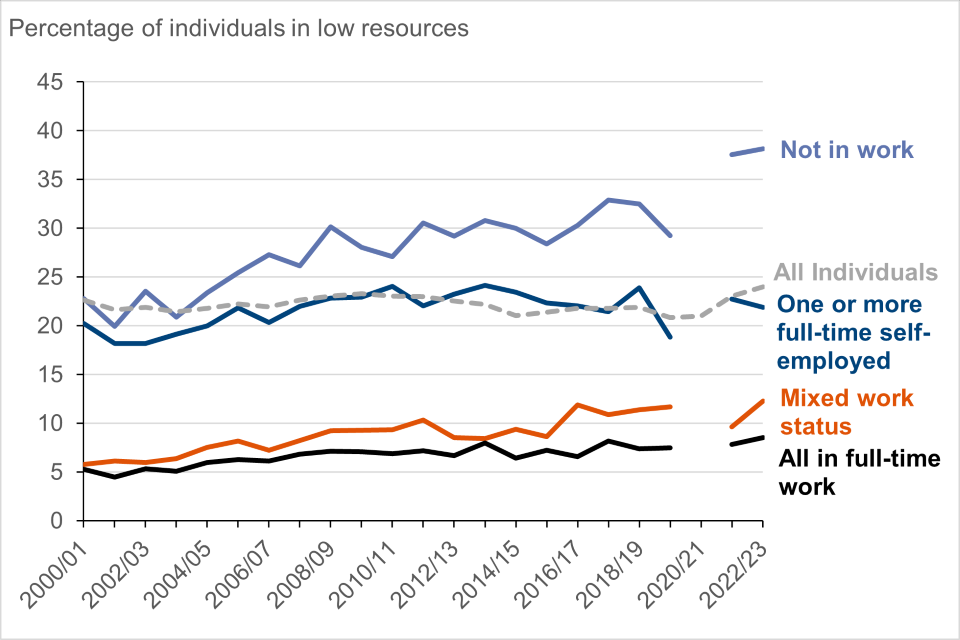 Figure 7: Percentage of individuals in low resources by economic status of benefit unit, FYE 2001 to FYE 2023