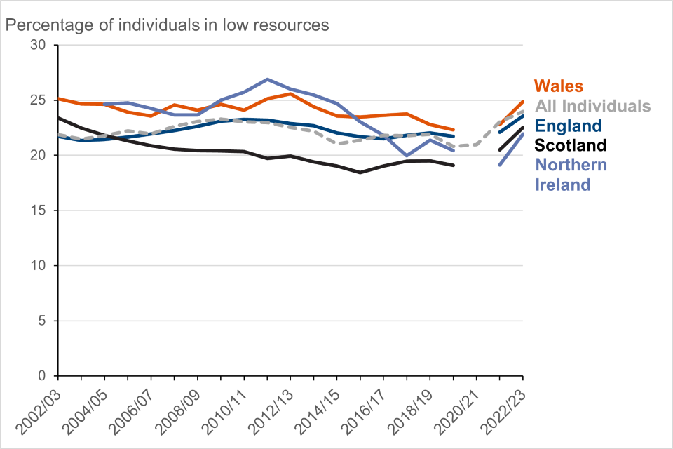 Figure 8: Percentage of individuals in low resources by country, FYE 2001 to FYE 2023