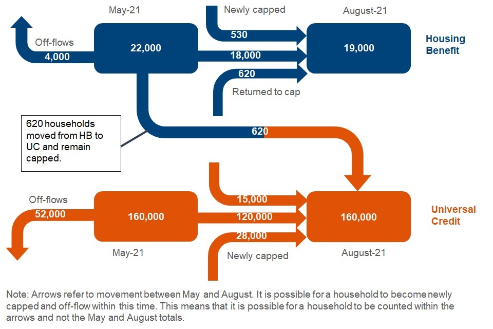 Note: Figures relating to on-flows, newly capped and off-flows refer to the time period of May 2021 to July 2021. Whereas figures relating to remaining capped or returning to the cap refer to the time period of May 2021 to August 2021. The difference is due to the methodology used to obtain outcome at off-flow (including households that flow from the HB cap to the UC cap), as it is not possible to obtain outcome data for August 2021, at August 2021. Figures within this release have been rounded in line with our rounding policy.