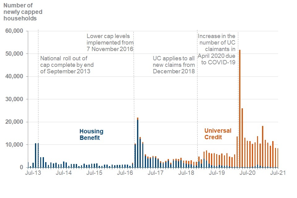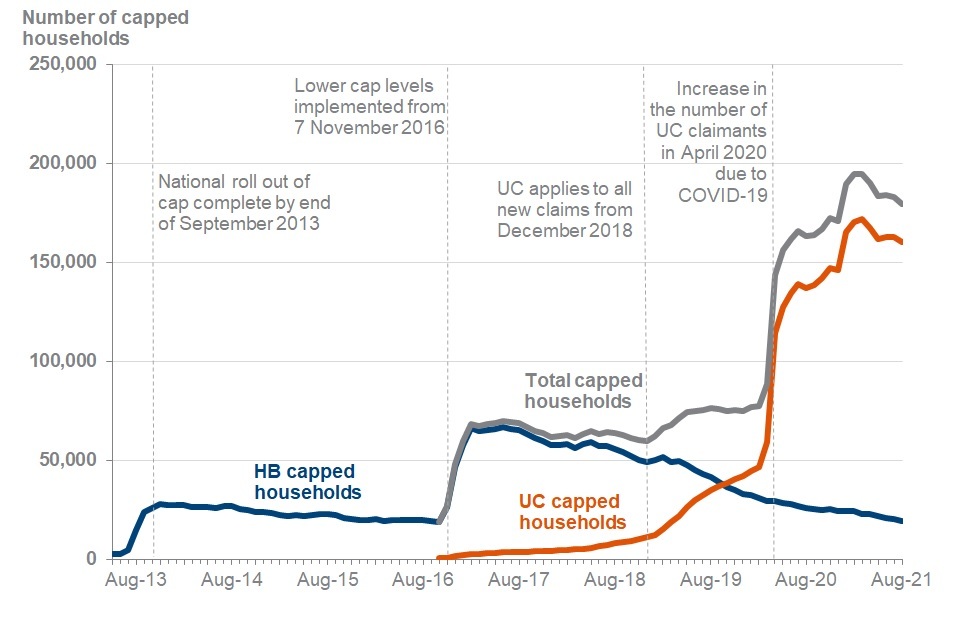Between October 2016 and August 2021, 350,000 households have had their UC capped at some point. Between April 2013 and August 2021, 220,000 households have had their HB capped at some point.