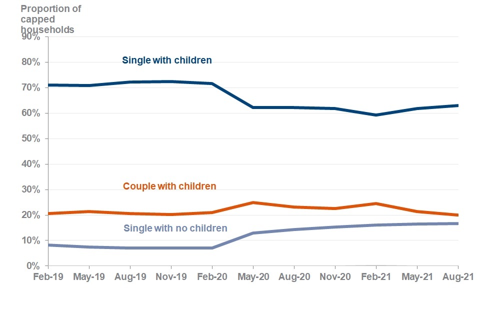 - higher proportion of capped households for single people with no children; from 7% at February 2020 to 17% at August 2021, which is the same as at May 2021