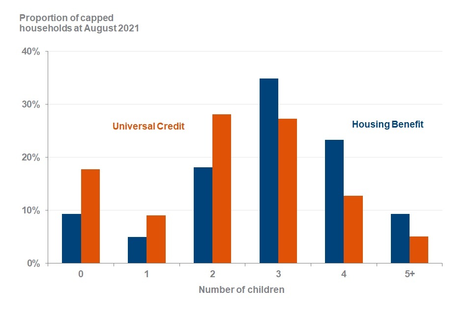 At August 2021, 150,000 households (83%) that had their benefits capped included children, 82% (130,000) of UC capped households included children and 91% (17,000) of HB capped households included children.