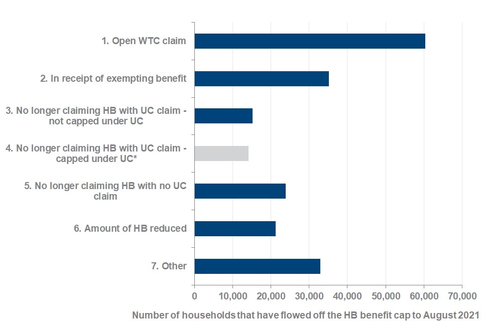 - 4,000 households off-flowed from the benefit cap, which means no longer on the benefit cap (between May 2021 and July 2021). Of the 4,000 off-flows, 52% (2,100 households) were no longer claiming HB. Of these, 79% (1,700) of households no longer claiming HB are now claiming UC
