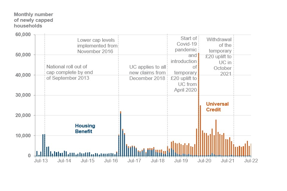 Monthly number of newly capped UC and HB households from April 2013 to July 2022