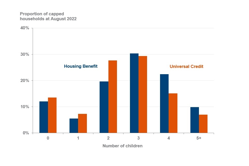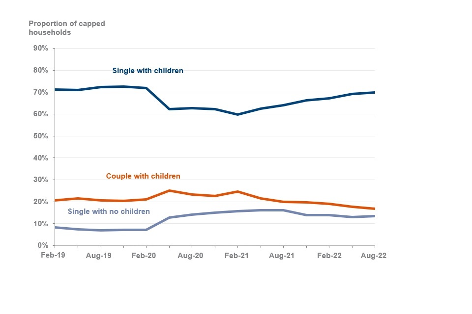 At August 2022, 87% (110,000) of total capped households that had their benefits capped included children. In UC, 86% (96,000) of capped households included children and in HB, 88% (11,000) of capped households included children.