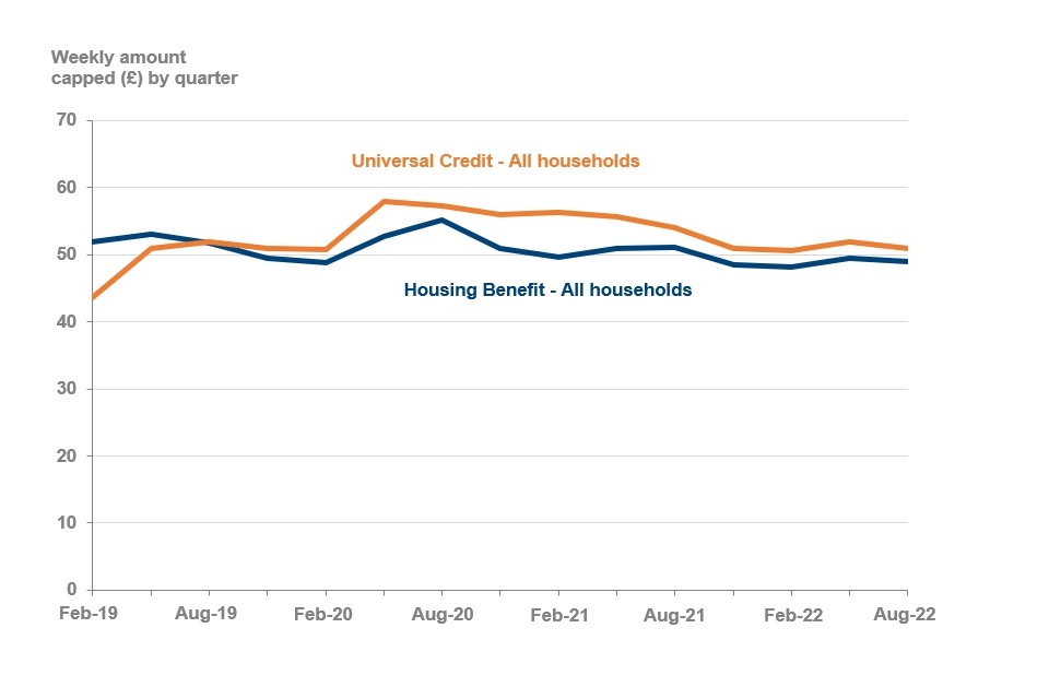 - 2% of households claiming HB or UC had their benefits capped at August 2022 which is the same as at May 2022