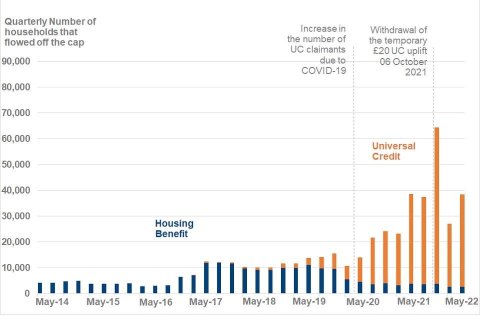Note: Newly capped households are those that have their benefits capped for the very first time. For UC, this excludes off-flows from the HB cap who then immediately become capped under UC. Due to the methodology used to obtain outcome at off-flow (including households that flow from the HB cap to the UC cap), it is not possible to obtain outcome data for May 2022, at May 2022.