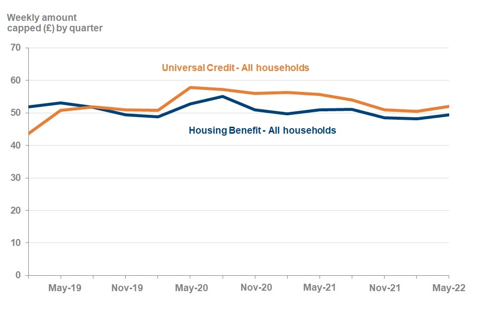 Whilst volumes of households capped on UC are greater than pre-pandemic levels, the proportion of capped households on the overall UC caseload is 2.4% at May 2022, which is more comparable to levels at the start of the COVID-19 pandemic.
