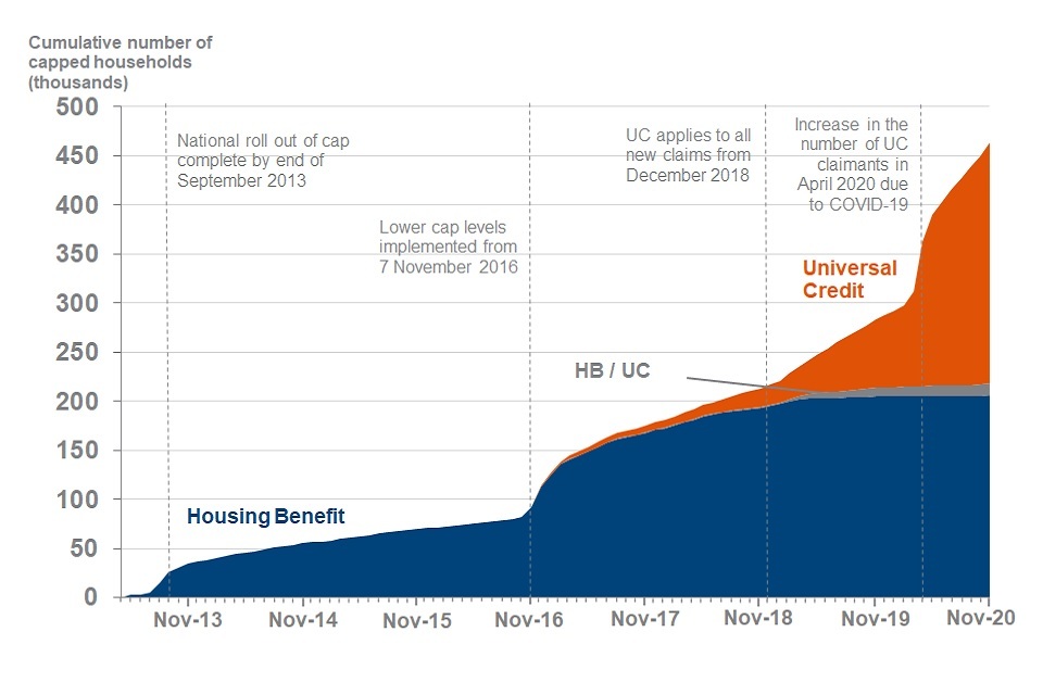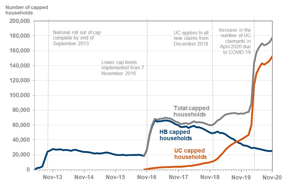 since April 2013, 460,000 households have been capped at some point. At November 2020, 290,000 households are no longer capped. Of these, 28% (80,000 households) are no longer capped due to working or earning enough to be exempt from the cap