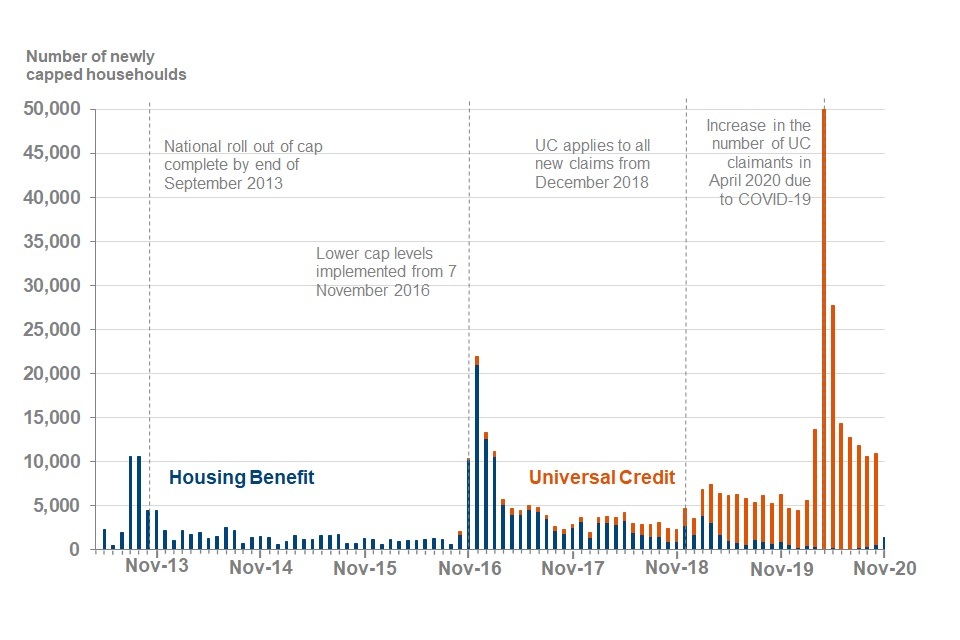 The statistics are released every 3 months and are sourced from data originally collected via administrative systems. Since November 2020 (data to August 2020), data for households capped under HB are taken from DWP HB Caseload Statistics, and data for households capped under UC are taken from DWP UC Quarterly Statistics.