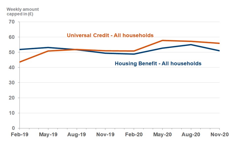The average monthly amount that UC households are capped by is £242, at November 2020. This is the equivalent of £56 per week, a decrease from £57 at August 2020. The average weekly amount that HB households are capped by is £51, at November 2020, a decrease from £55 at August 2020.