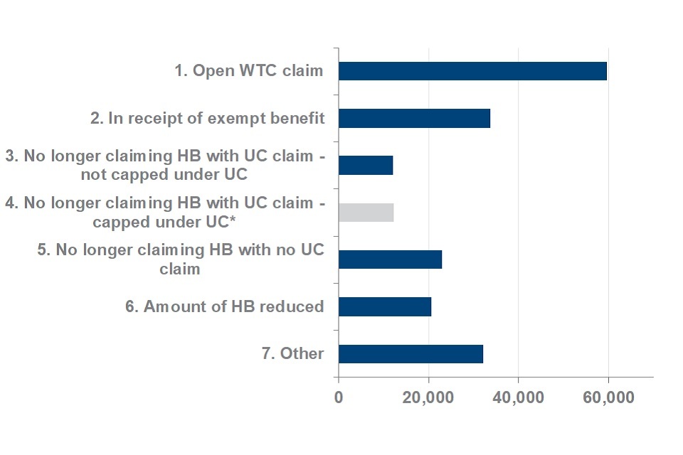 Outcome statistics for households no longer capped under UC are still under development and are not comparable with statistics for outcomes of those who are no longer capped under HB. Outcomes figures related to moving into work have been presented separately for UC and HB. This is because under UC, a household is exempt from the cap when earnings in each assessment period are at least the level of the earnings exemption threshold (for 2020 to 2021 this is £604). Under HB, a household becomes exempt from the cap if it is entitled to WTC, which depends on hours of paid work (at least 30 hours for those aged 25 to 59, at least 16 hours for single people with 1 or more children, and at least 24 hours between a couple with 1 or more children).