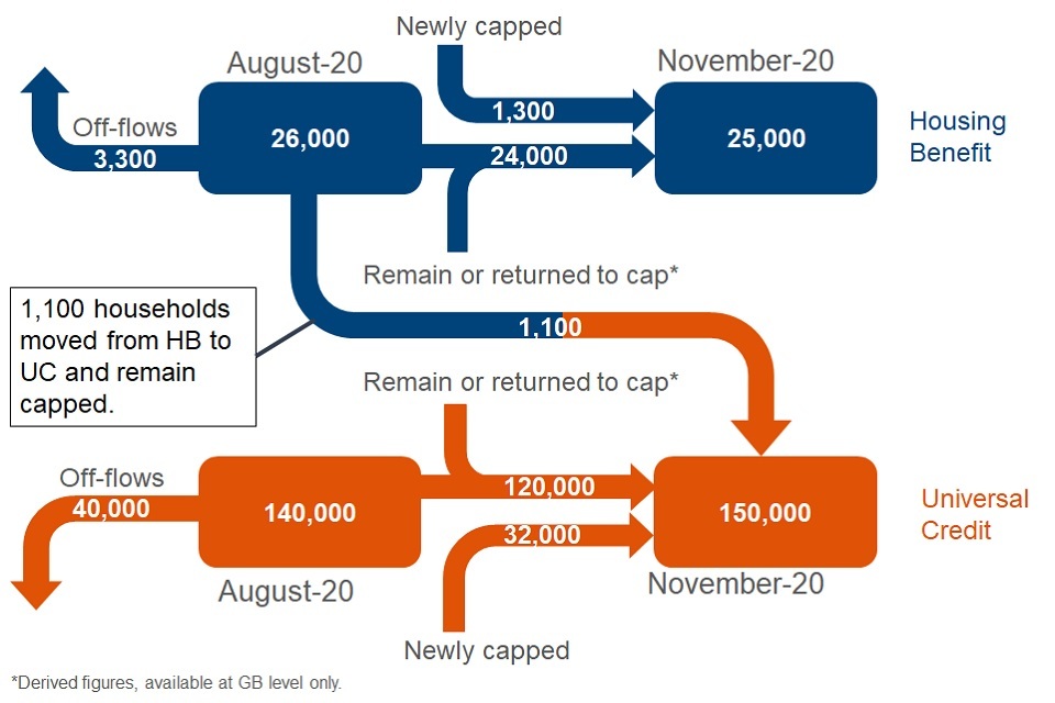 at November 2020, the overall number of UC capped households is increasing (150,000 households compared with 140,000 households at August 2020). However, there are more households coming off the UC cap (40,000 households) than the number of households that are new to the UC cap (33,000 households). The increase in UC capped households is therefore due to previously capped households returning to the cap