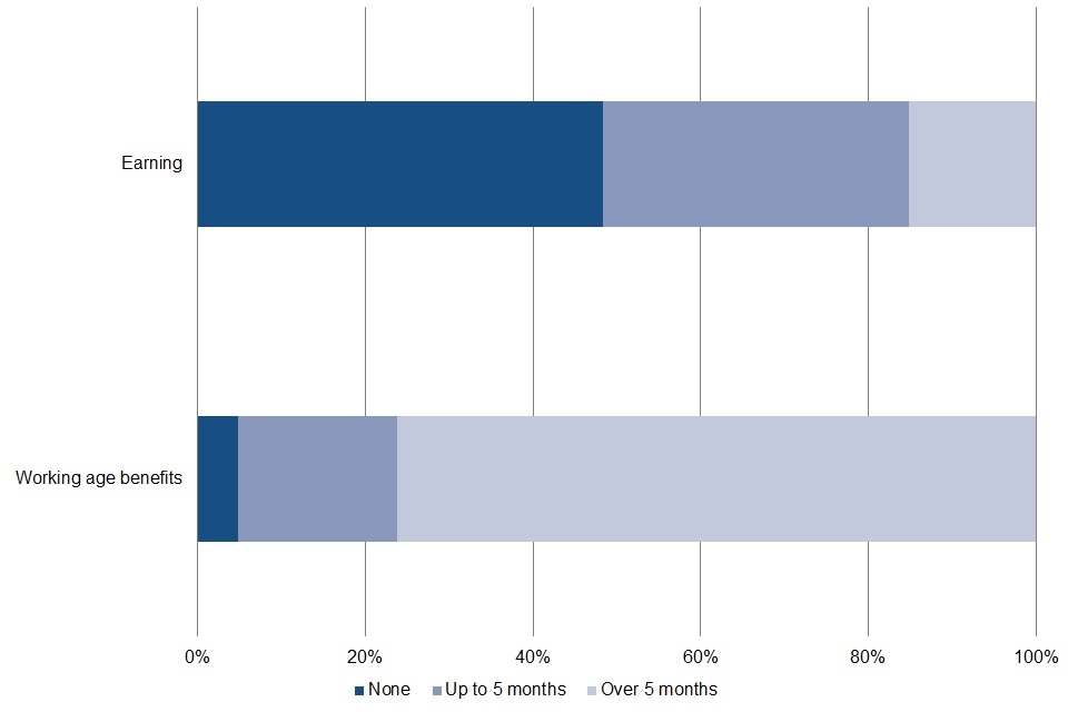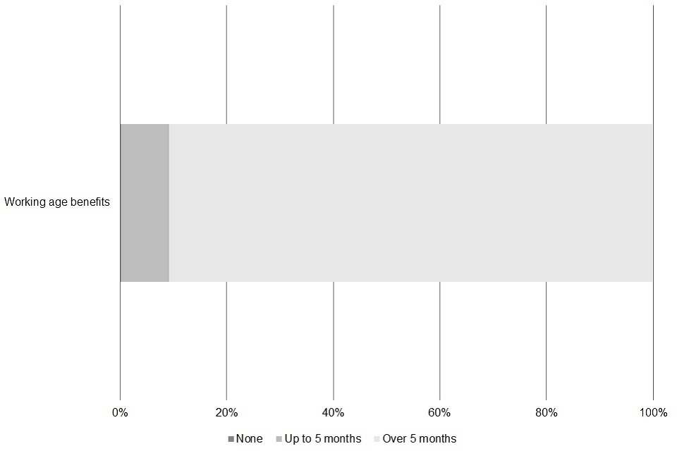 In the 180 days following an ESA (WRAG) sanction decision, 0.2% of claimants were not in receipt of any of the tracked benefits (ESA (WRAG), UC, JSA or IS). 90.8% of claimants spent over 150 days (5 months) in receipt of benefit and 85.0% of claimants spent the full 180 days in receipt of benefit.