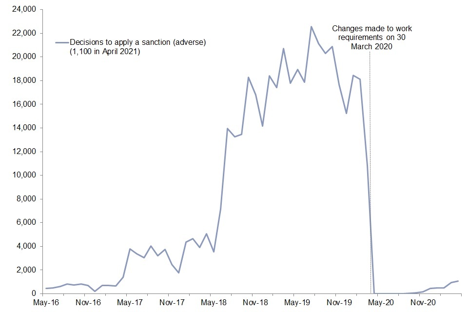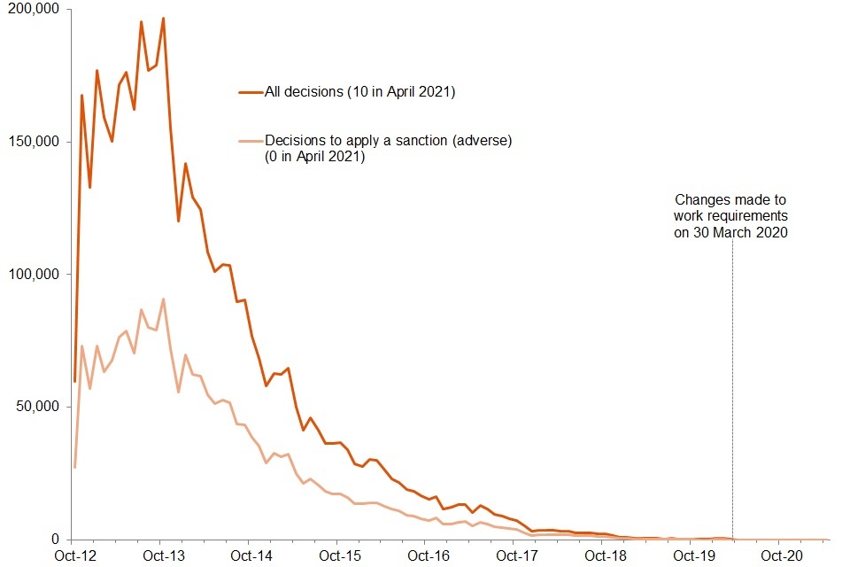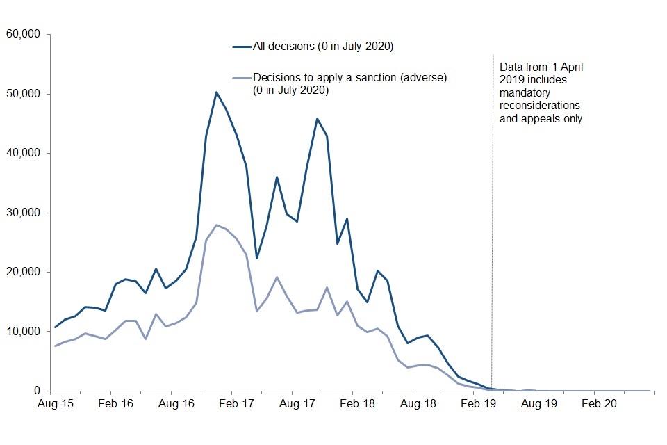 The numbers of adverse sanction decisions reached a peak in July 2019 after following an upward trend as UC full service was rolled out and the UC caseload built up. In March 2020 the number of adverse sanction decisions decreased to 11,000. The number of adverse sanction decisions continued to drop following the legislative changes to work requirements on 30 March (in response to the coronavirus (COVID-19) pandemic).